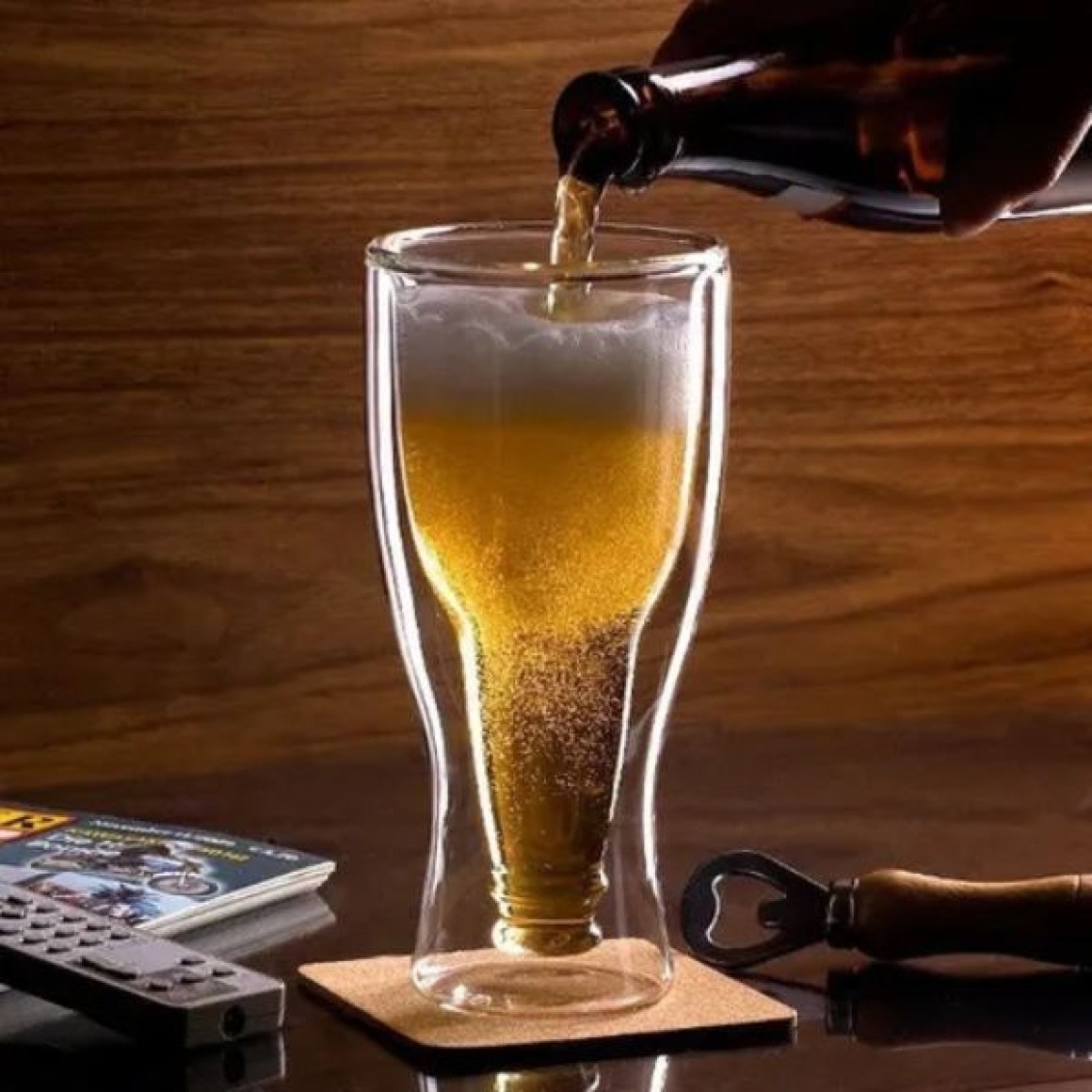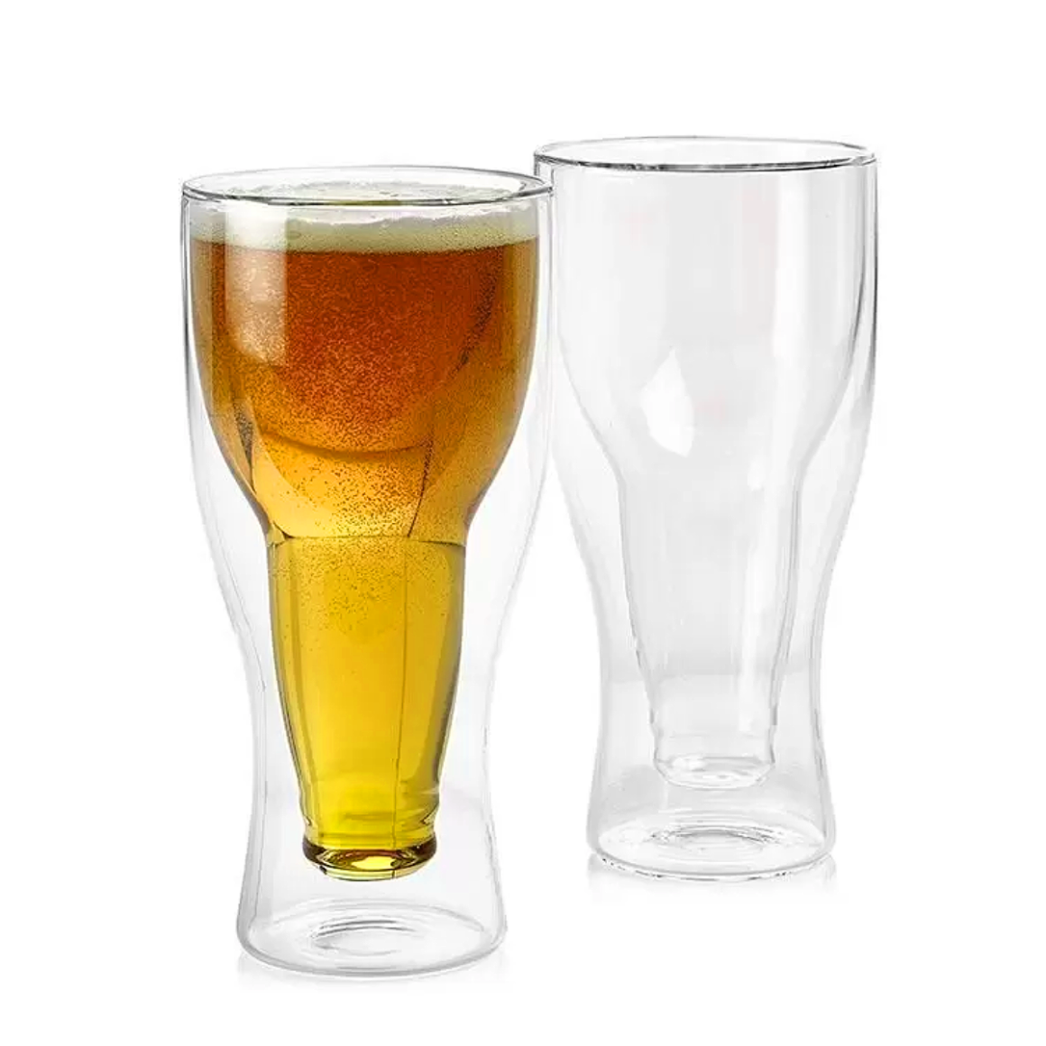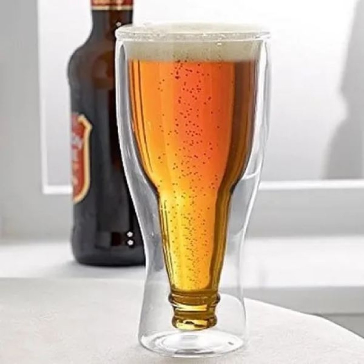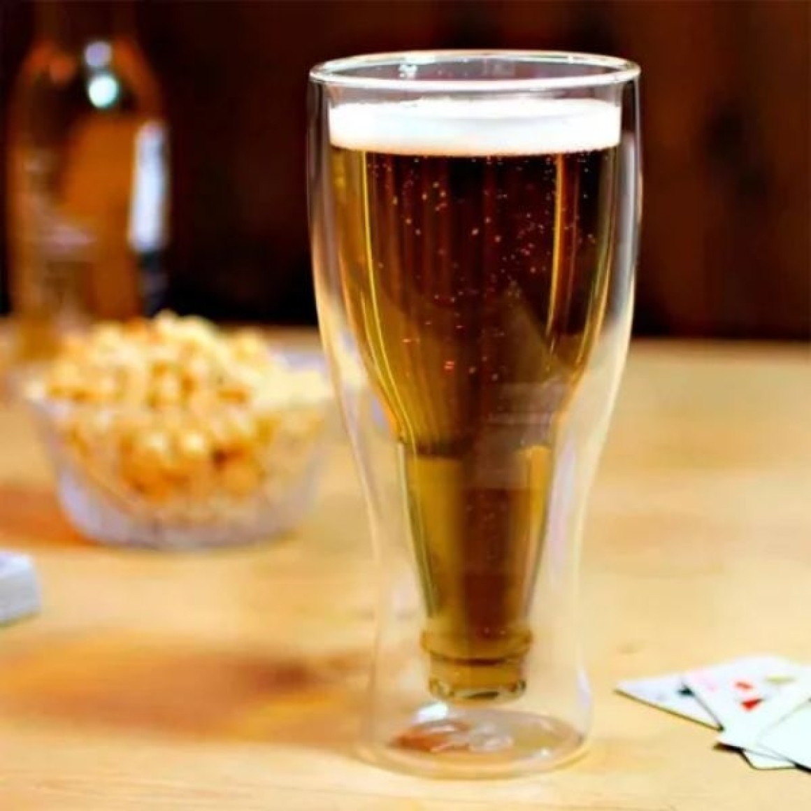 O copo cristal garrafa de cerveja invertida possui um design divertido, composto de parede dupla 100% acrílico.