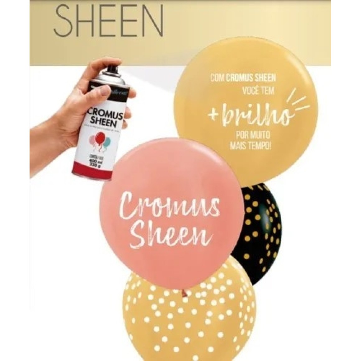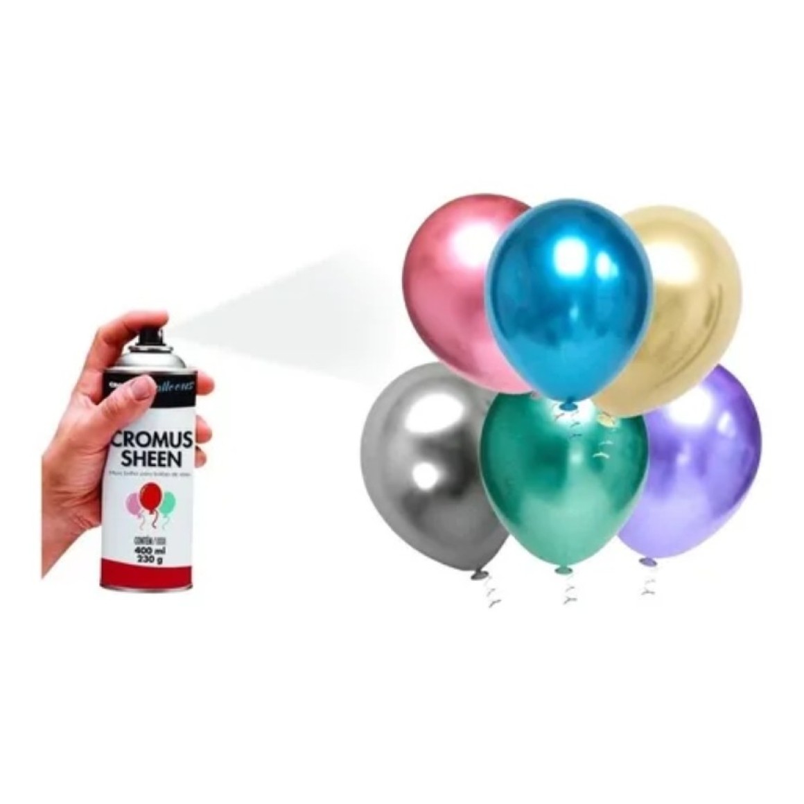 Instruções de uso: Para obter um excelente acabamento, agite antes de usar e em seguida aplique o Cromus Sheen a uma distância de 20 centímetros para que o produto atue deixando uma fina película sobre o balão.