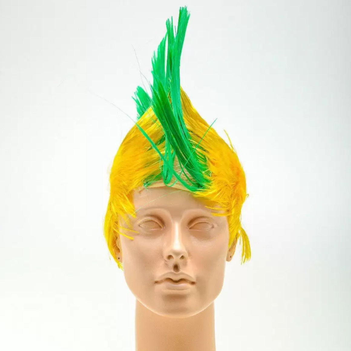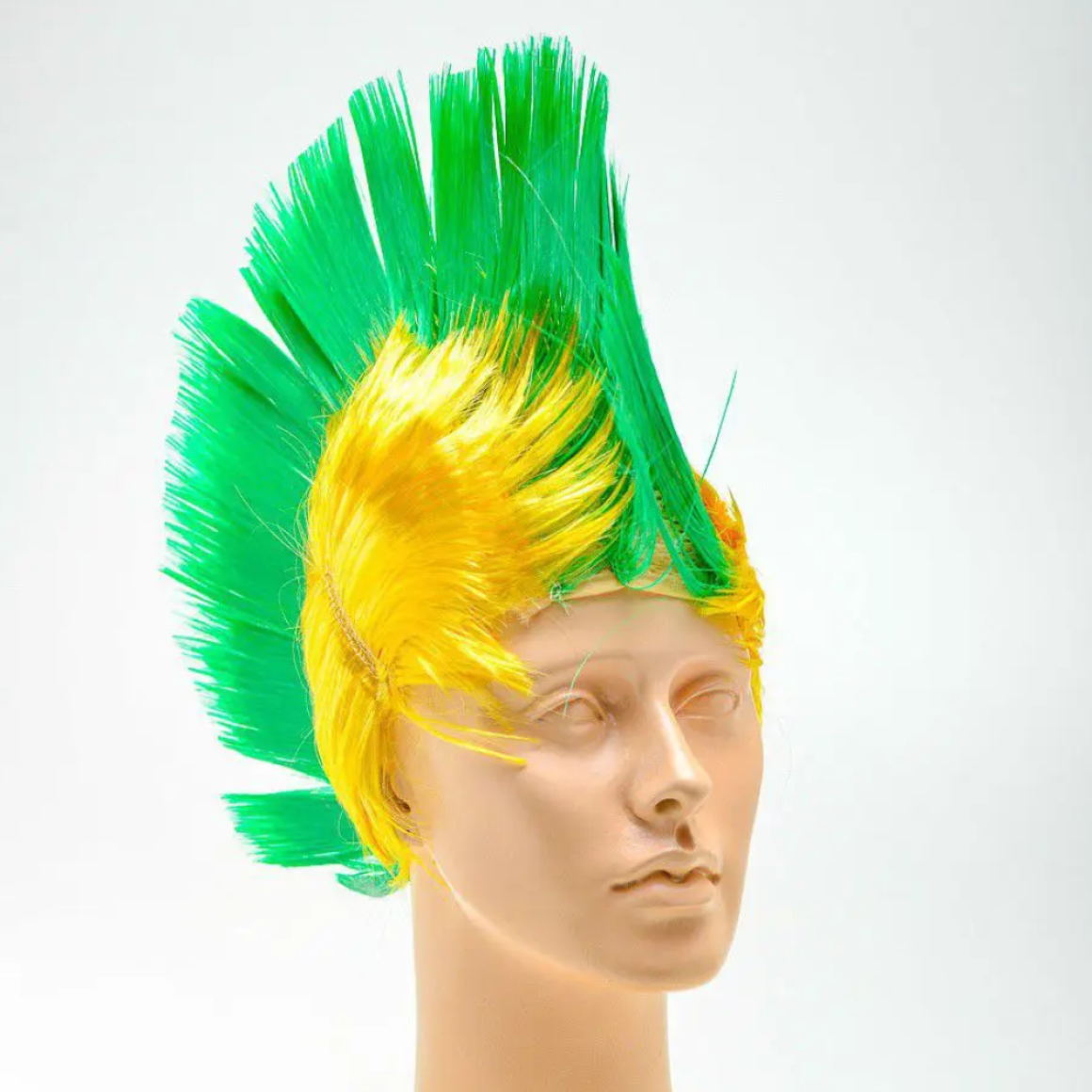 A peruca moicano verde e amarela possui fios sintéticos brilhantes e dispostos de uma maneira arrepiada, possui uma touca elástica que se adapta de forma justa à cabeça. Vista sua camisa do Brasil e coloque essa peruca divertida, fique literalmente de cabelo arrepiado enquanto torce pelo Brasil. Esta peruca com os cabelos arrepiados é perfeita para assistir e torcer pela nossa Seleção Brasileira nos jogos da Copa do Mundo, é perfeita também para festa a fantasia e Carnaval.