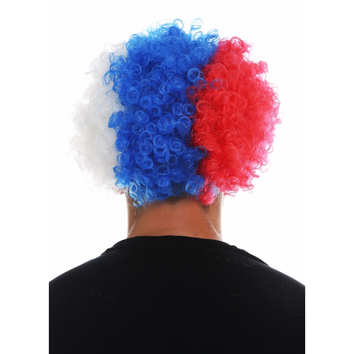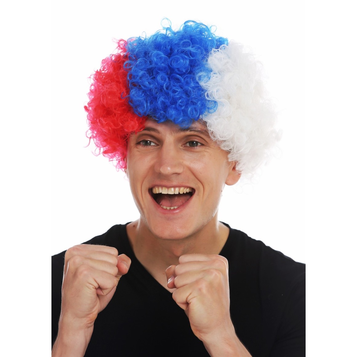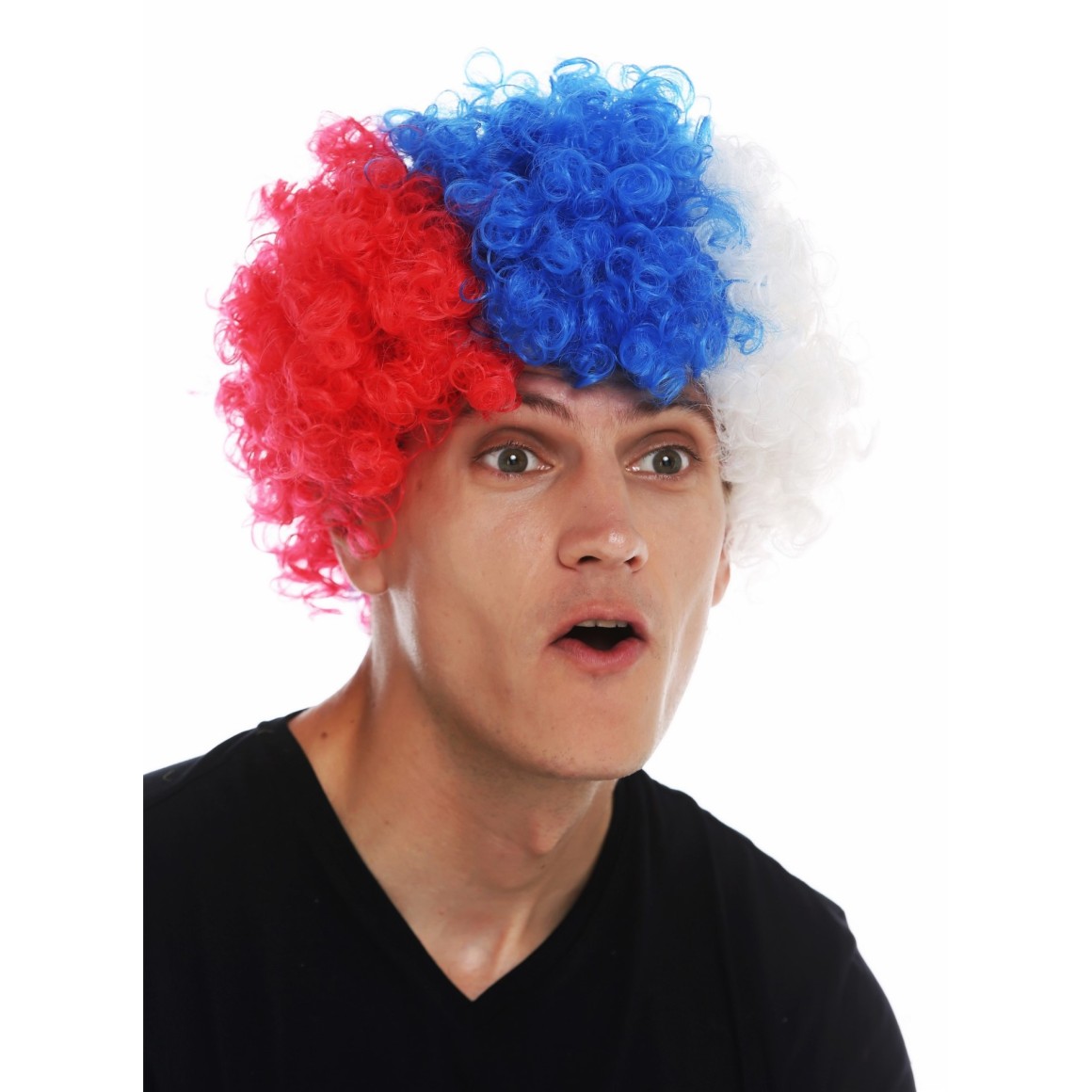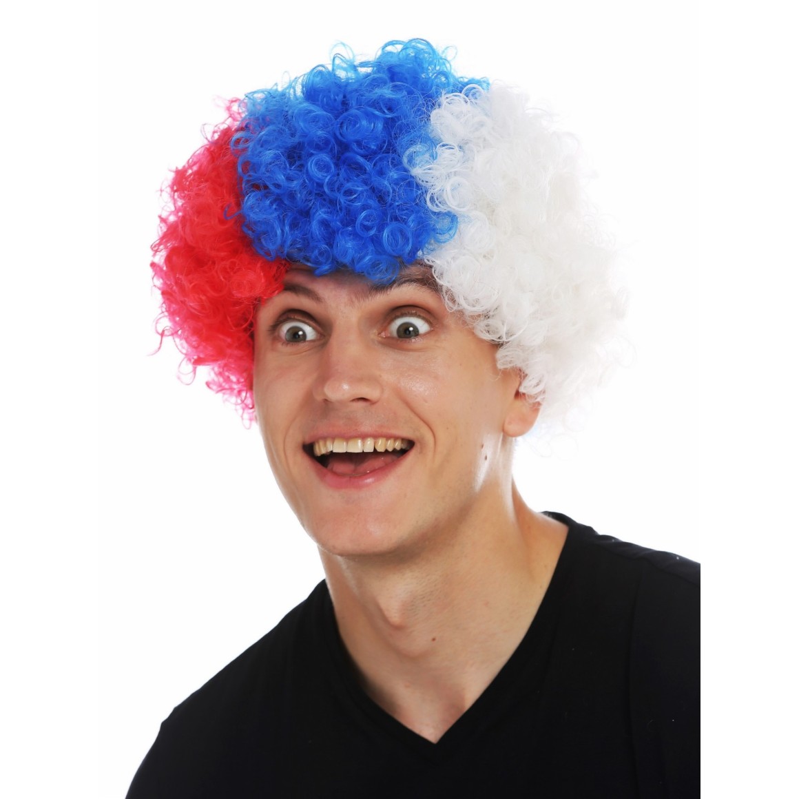 Peruca afro, densa encaracolada dividida verticalmente em azul vermelho e branco.