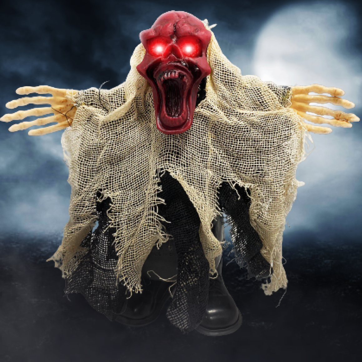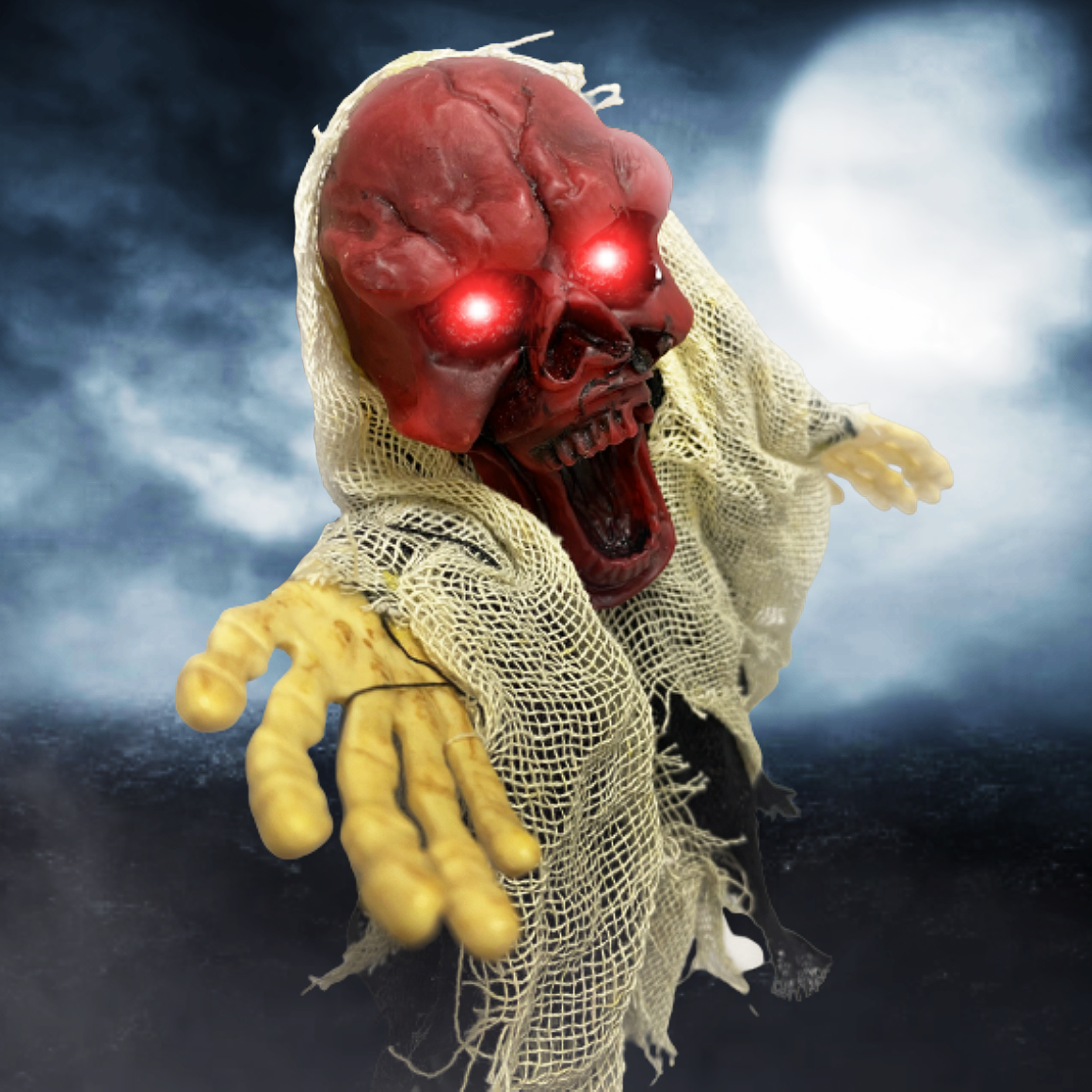 Boneco Elétrico Caveira Fantasma Boca Aberta com Olhos de LED e Movimentos