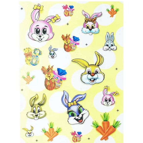 Os adesivos tem imagens vibrantes e de alta qualidade, são feitos em papel autocolante e contém imagens diversas,como coelhinhos, cenouras e ovos de Páscoa. Além disso, são excelentes opções de decoração para diversos tipos de superfícies e itens em uma festa.