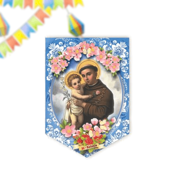 O Banner Santo Antônio é um painel decorativo, fabricado em papel cartonado de alta qualidade. É ilustrado com uma linda imagem de Santo Antônio e charmosas flores em sua moldura.