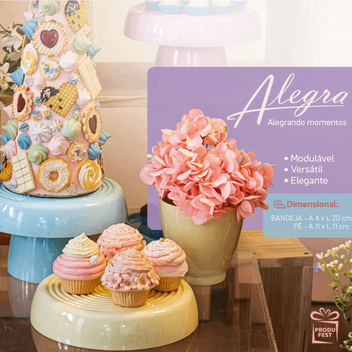 A boleira modelo Alegra é um sucesso para sua festa. Pode ser usada como decoração e manter o estilo até na hora de servir as delícias como docinhos, bolos e outras guloseimas.