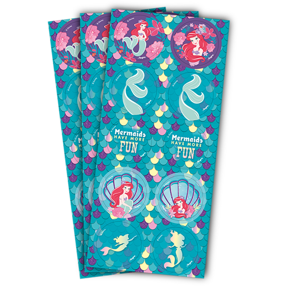 Decore sua festa Ariel Sereismo com os adesivos Regina. São três cartelas com dez unidades de adesivos em cada. Todos os adesivos são estampados com ilustrações de Ariel Sereismo.