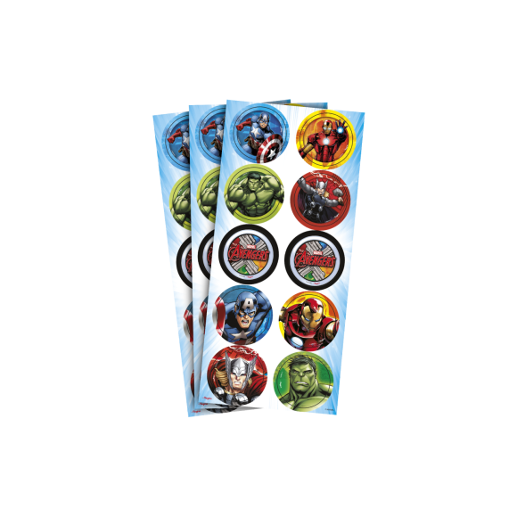 Decore sua festa Avengers Animated com os adesivos Regina. São três cartelas com dez unidades de adesivos em cada. Todos os adesivos são estampados com ilustrações de Avengers Animated.