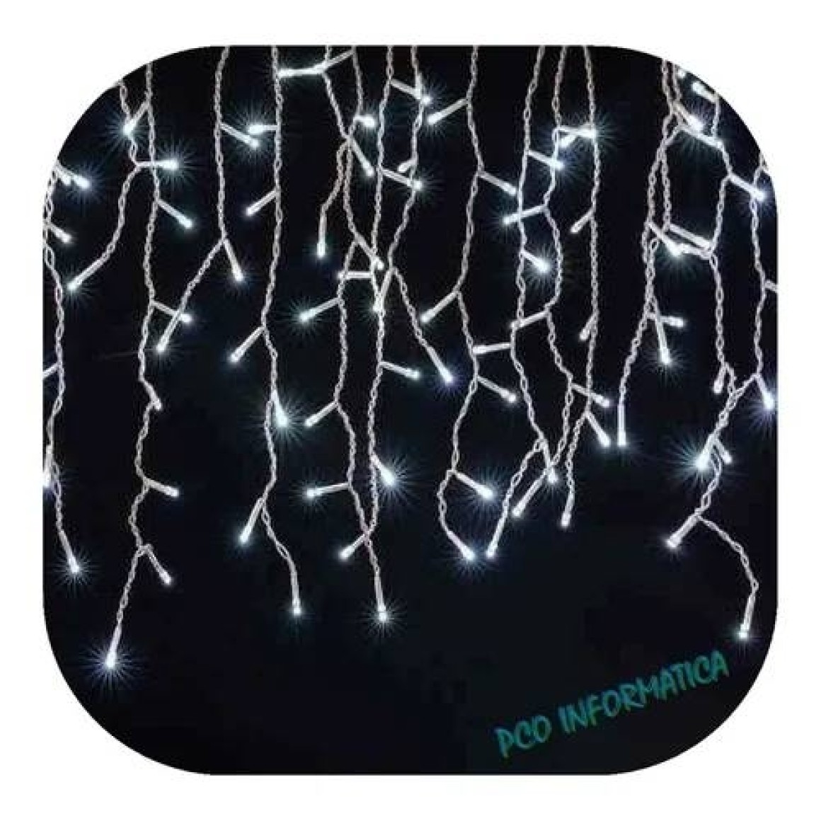 Cascata com 120 lâmpadas de led 110v na cor branco tendo 2.80 metros.