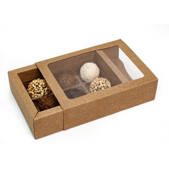 Caixa Gaveta para 6 Doces com Visor e Berço Kraft.
