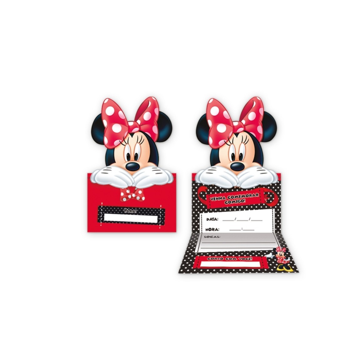 Aqui começa a primeira experiência da sua festa! Surpreenda seus convidados de modo especial e único, chamando quem você mais ama para curtir esse dia tão especial. Além de ser um ícone super tradicional para sua festa, os convidados poderão guardar o convite red minnie grande com carinho após a festa.