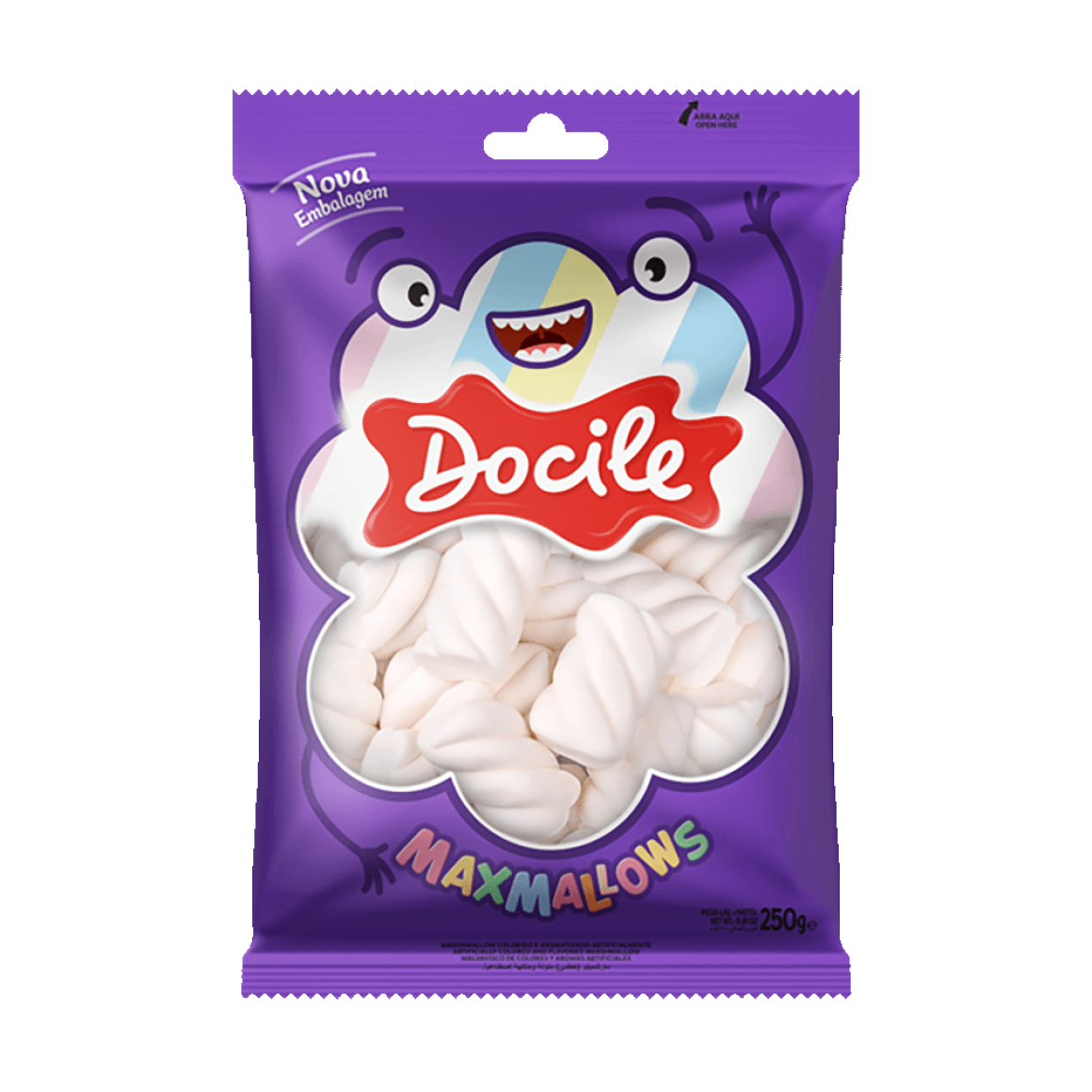 Os MaxMallows Docile fazem a alegria de todos, são extremamente macios e super deliciosos, com um sabor delicado e surpreendente, cores suaves e formatos que vão dos tradicionais aos divertidos.